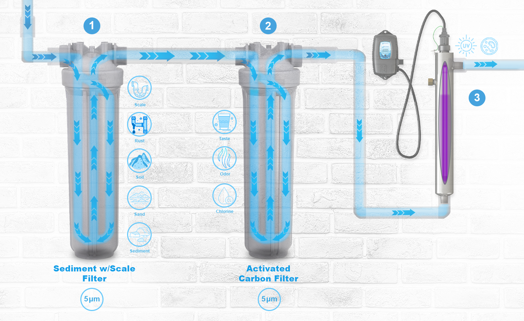 • First Stage: Water enters our 5-micron sediment filter with scale to filter out any dirt, sand, silt, and conditions your hard water to prevent any limescale buildup. This ensures optimal and maximum