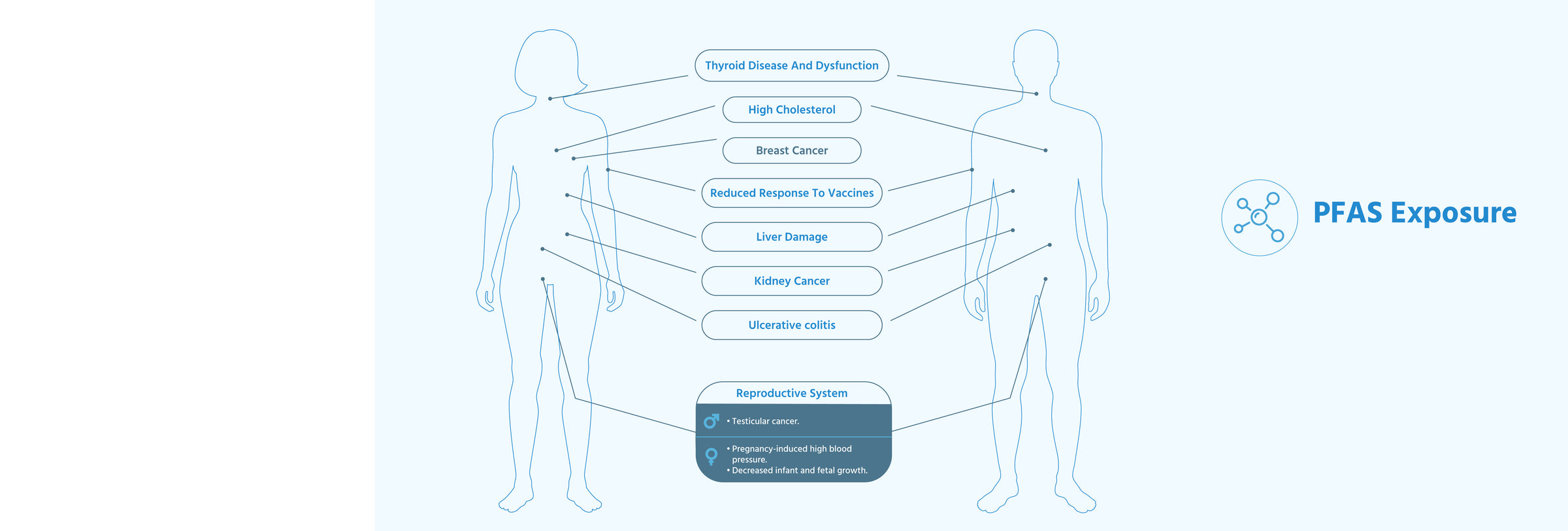 Ongoing exposure to PFAS through contaminated water and other sources has been associated with various cancers, according to the CDC, EPA, and American Cancer Society, including: