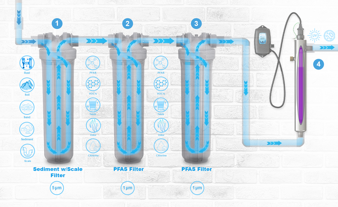 PFAS (per- and polyfluoroalkyl substances) are persistent synthetic chemicals found in many products. They contaminate water sources across the USA, with the EPA estimating that 60% of the population may face PFAS in tap water, exposing around 70 million people to these "forever chemicals." Our Ultimate Whole House PFAS Filtration system, with dual 1-micron filters, protects your entire home from these toxic substances.